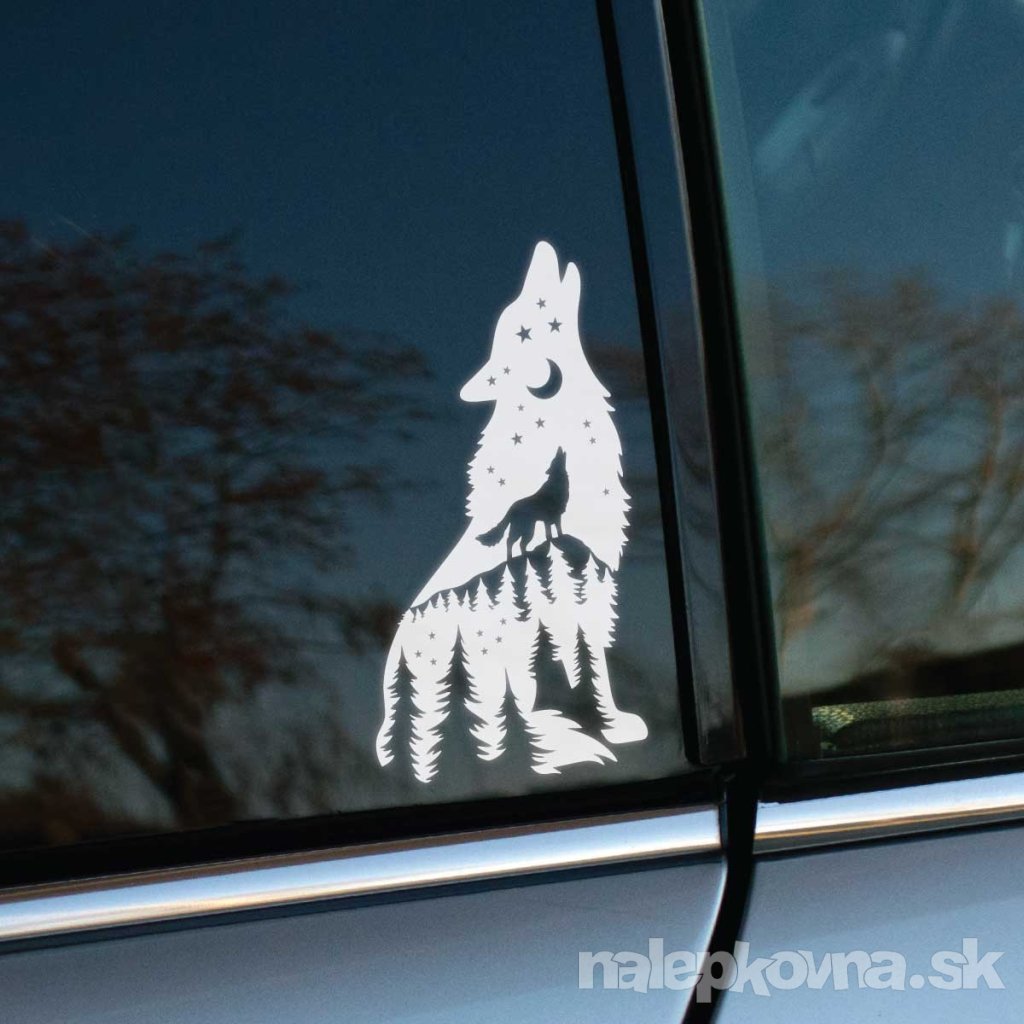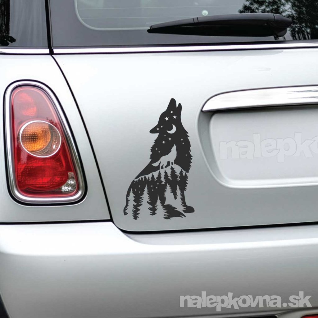 Nálepka Vlk hviezdy mesiac je vizuálnou definíciou slobody pre tých, ktorí sa v tme cítia viac doma než pod žiarivkami v kanclíku.