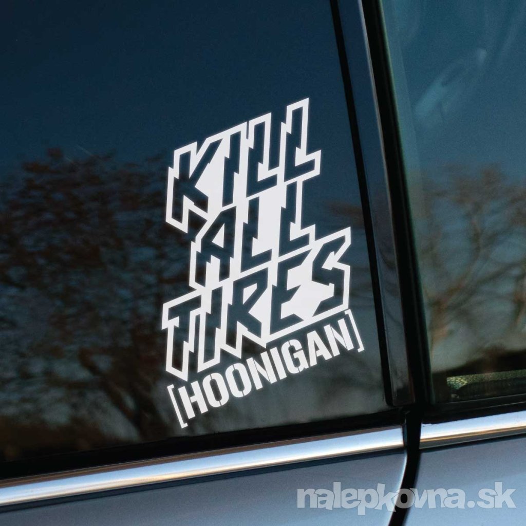 KILL ALL TIRES [HOONIGAN] je manifestom každého, kto nepovažuje pneumatiky za kus gumy, ale za spotrebný materiál na ceste k čistému adrenalínu. Tento vertikálny, ostro rezaný dizajn s ikonickým nápisom v hranatých zátvorkách je jasným signálom, že tvoje auto netrpí nedostatkom krútiaceho momentu a ty netrpíš nedostatkom odvahy.