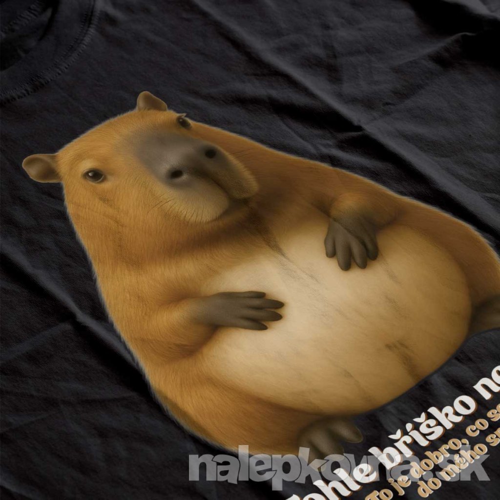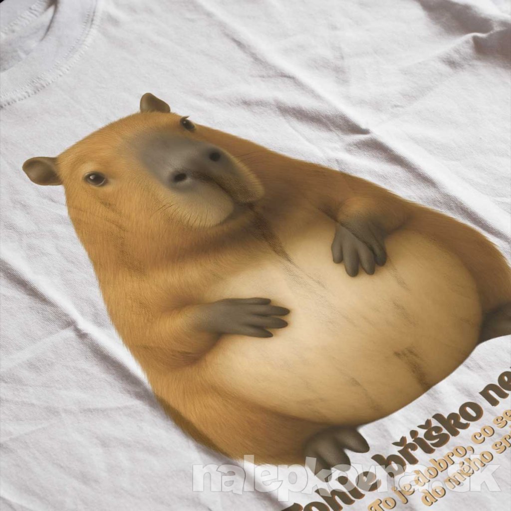 Tohle bříško není tuk! To je dobrota, co se nevešla do mýho srdíčka! – nie je to výhovorka, je to vyhlásenie s úsmevom. Návrh, ktorý sa pozerá priamo na spoločenské predsudky a odpovedá im kapybarou – pokojnou, mäkkou, vyrovnanou. Ikona vnútornej pohody, ktorá nepotrebuje schvaľovanie, len priestor.